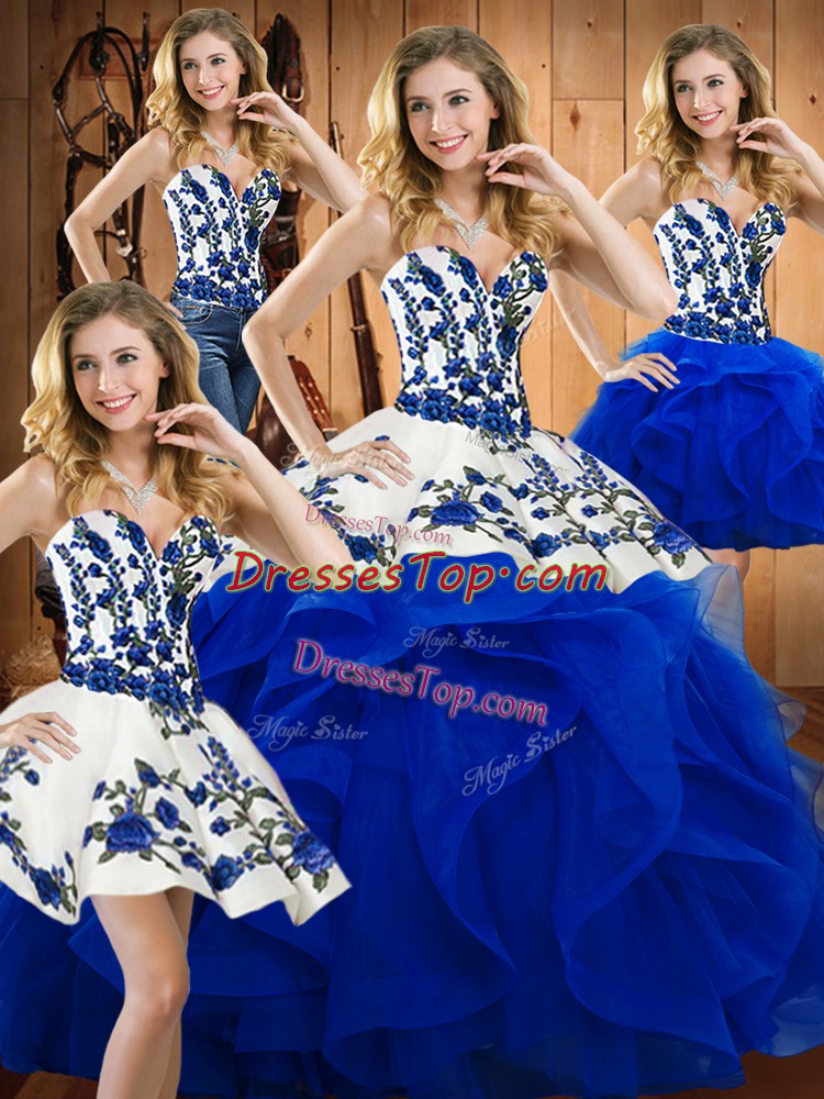 Sleeveless Satin and Organza Floor Length Lace Up 15 Quinceanera Dress in Blue with Embroidery and Ruffles