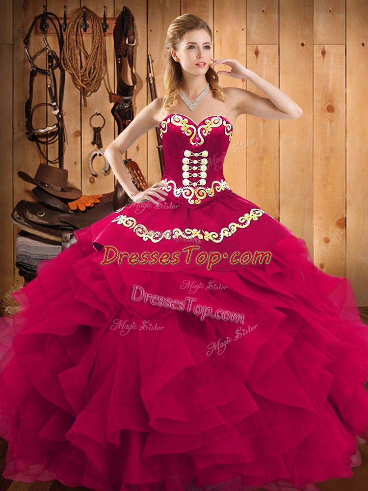 Sleeveless Satin and Organza Floor Length Lace Up 15 Quinceanera Dress in Fuchsia with Embroidery and Ruffles