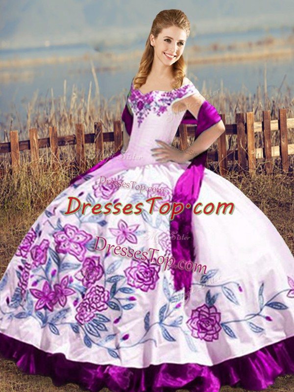 Sleeveless Satin and Organza Floor Length Lace Up Quinceanera Gowns in Purple with Embroidery