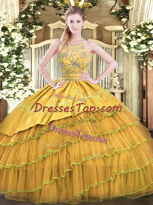 Sleeveless Satin and Organza Floor Length Zipper Sweet 16 Quinceanera Dress in Gold with Beading and Embroidery and Ruffled Layers