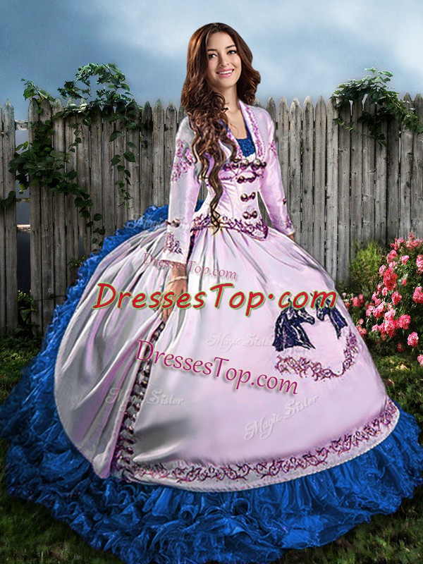Sleeveless Satin Floor Length Lace Up Sweet 16 Quinceanera Dress in Blue And White with Embroidery and Ruffles