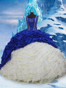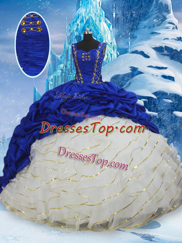 Sleeveless Taffeta Brush Train Lace Up Quinceanera Gown in Blue And White with Ruffled Layers and Pick Ups