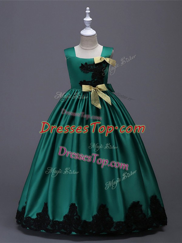 Sleeveless Taffeta Floor Length Zipper Girls Pageant Dresses in Dark Green with Appliques and Bowknot