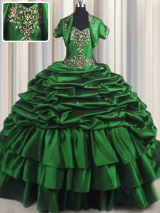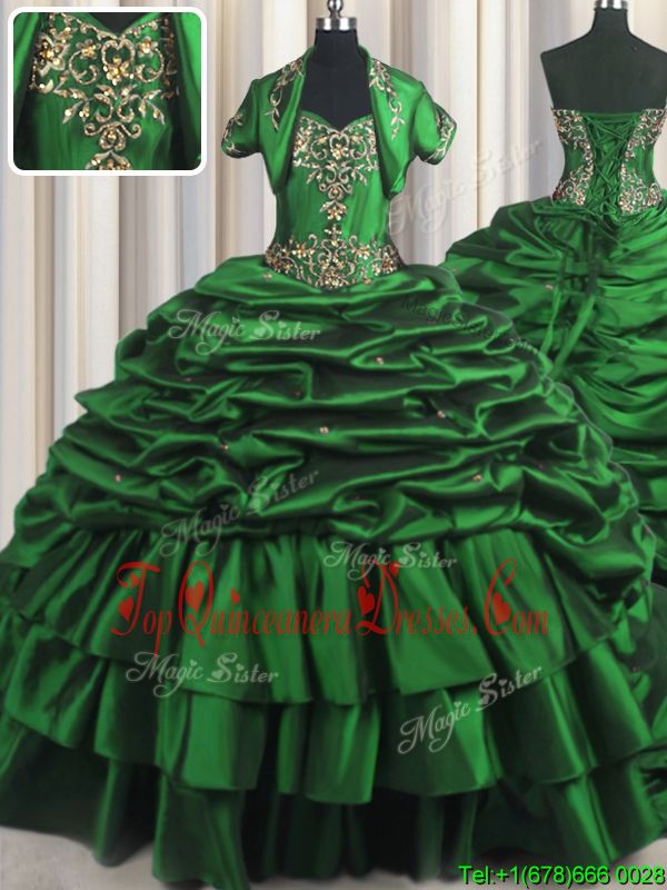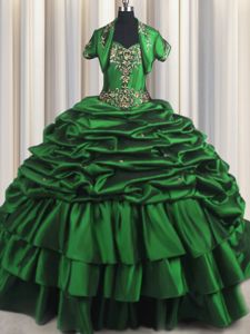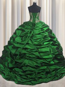 Sleeveless Taffeta With Brush Train Lace Up Ball Gown Prom Dress in Dark Green for with Beading and Appliques and Pick Ups