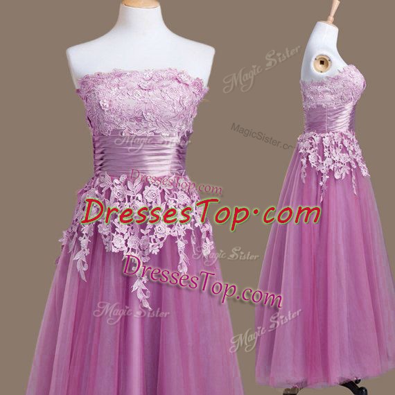 Sleeveless Tea Length Appliques Lace Up Dama Dress for Quinceanera with Lilac