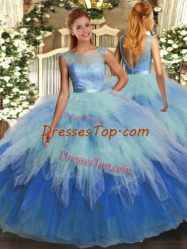 Sleeveless Tulle Floor Length Backless Quince Ball Gowns in Multi-color with Ruffles