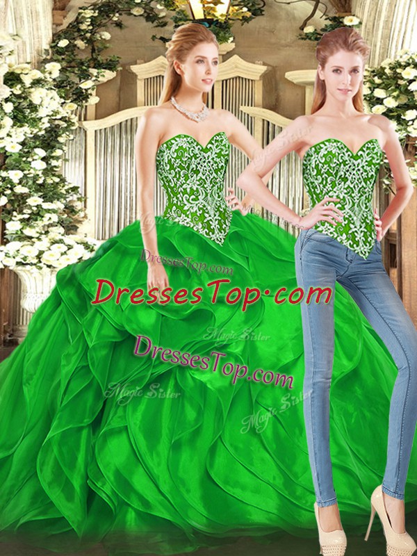 Sleeveless Tulle Floor Length Lace Up 15 Quinceanera Dress in Green with Beading and Ruffles