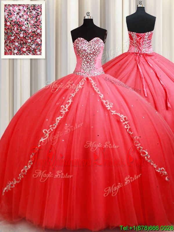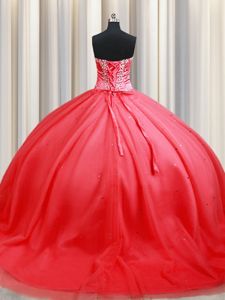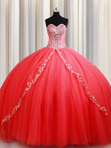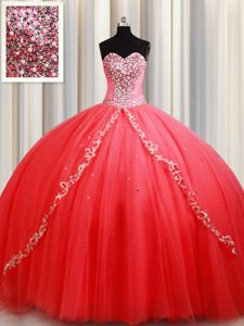 Sleeveless Tulle Floor Length Lace Up 15th Birthday Dress in Coral Red for with Beading and Appliques