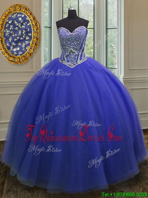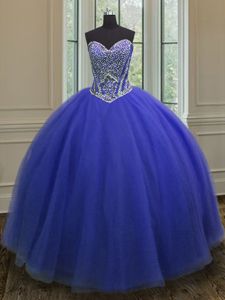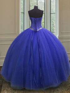 Sleeveless Tulle Floor Length Lace Up 15th Birthday Dress in Royal Blue for with Beading