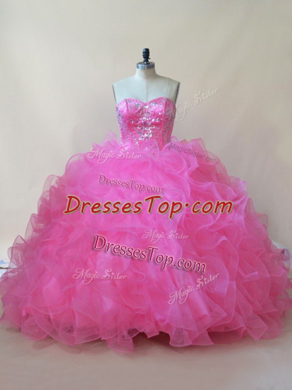Sleeveless Tulle Floor Length Lace Up Ball Gown Prom Dress in Hot Pink with Beading and Ruffles