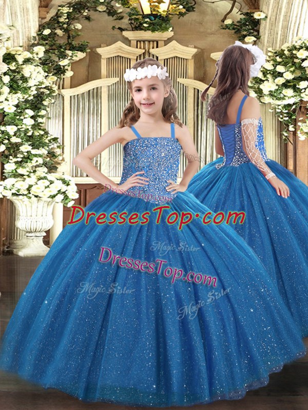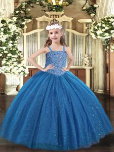 Sleeveless Tulle Floor Length Lace Up Custom Made Pageant Dress in Blue with Beading