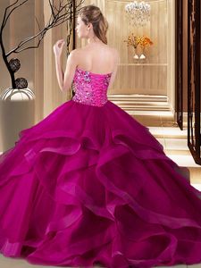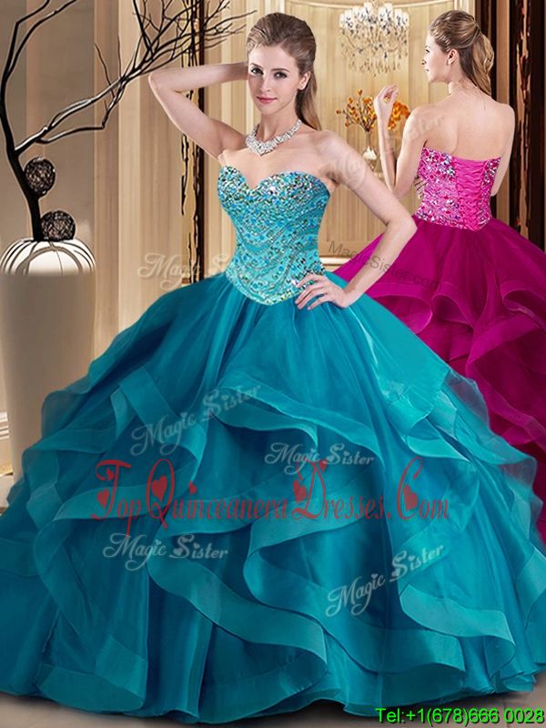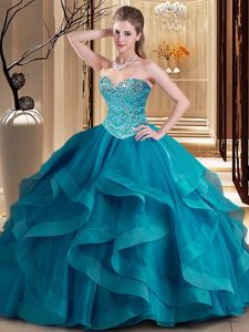 Sleeveless Tulle Floor Length Lace Up Quince Ball Gowns in Teal for with Beading and Ruffles