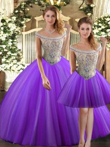 Sleeveless Tulle Floor Length Lace Up Quinceanera Dress in Eggplant Purple with Beading