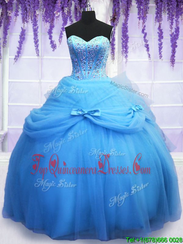 Sleeveless Tulle Floor Length Lace Up Quinceanera Dresses in Blue for with Beading and Bowknot