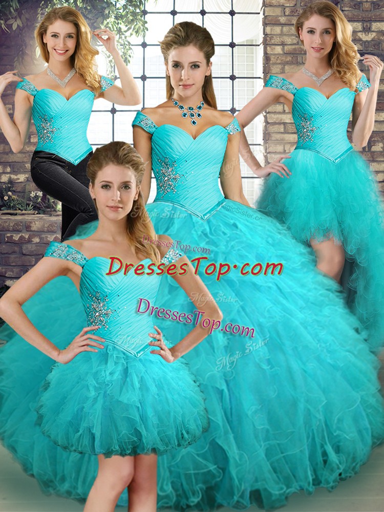 Sleeveless Tulle Floor Length Lace Up Quinceanera Gowns in Aqua Blue with Beading and Ruffles