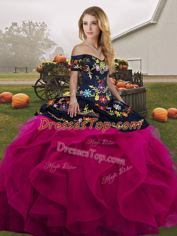 Sleeveless Tulle Floor Length Lace Up Quinceanera Gowns in Fuchsia with Embroidery and Ruffles