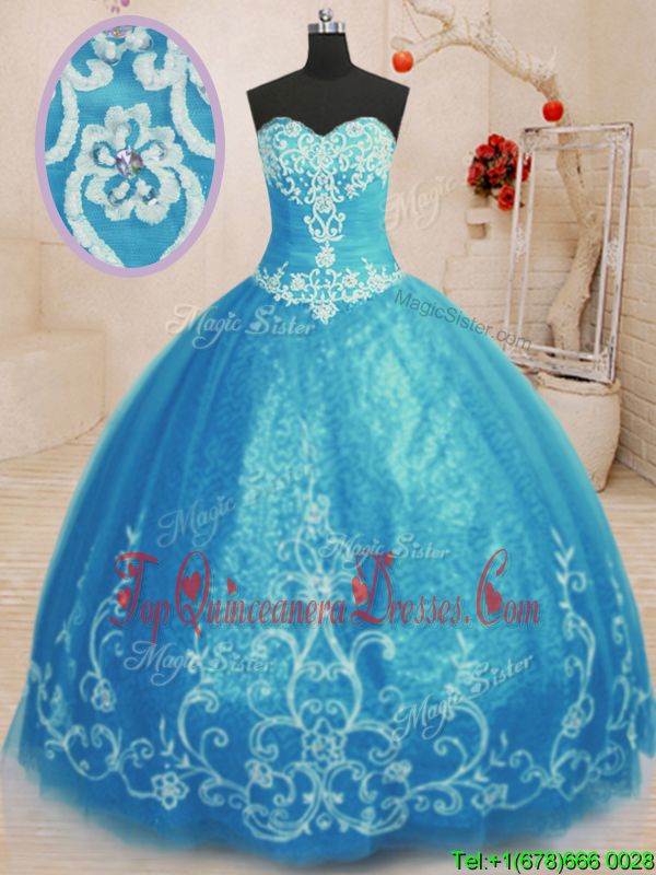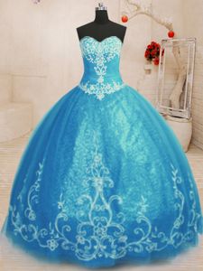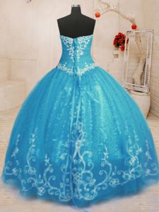 Sleeveless Tulle Floor Length Lace Up Sweet 16 Dresses in Baby Blue for with Beading and Embroidery