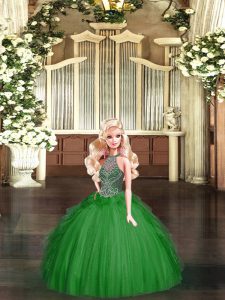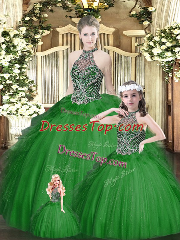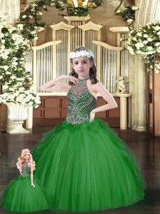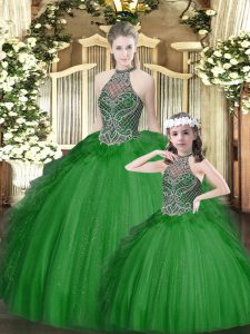 Sleeveless Tulle Floor Length Lace Up Sweet 16 Quinceanera Dress in Green with Beading and Ruffles