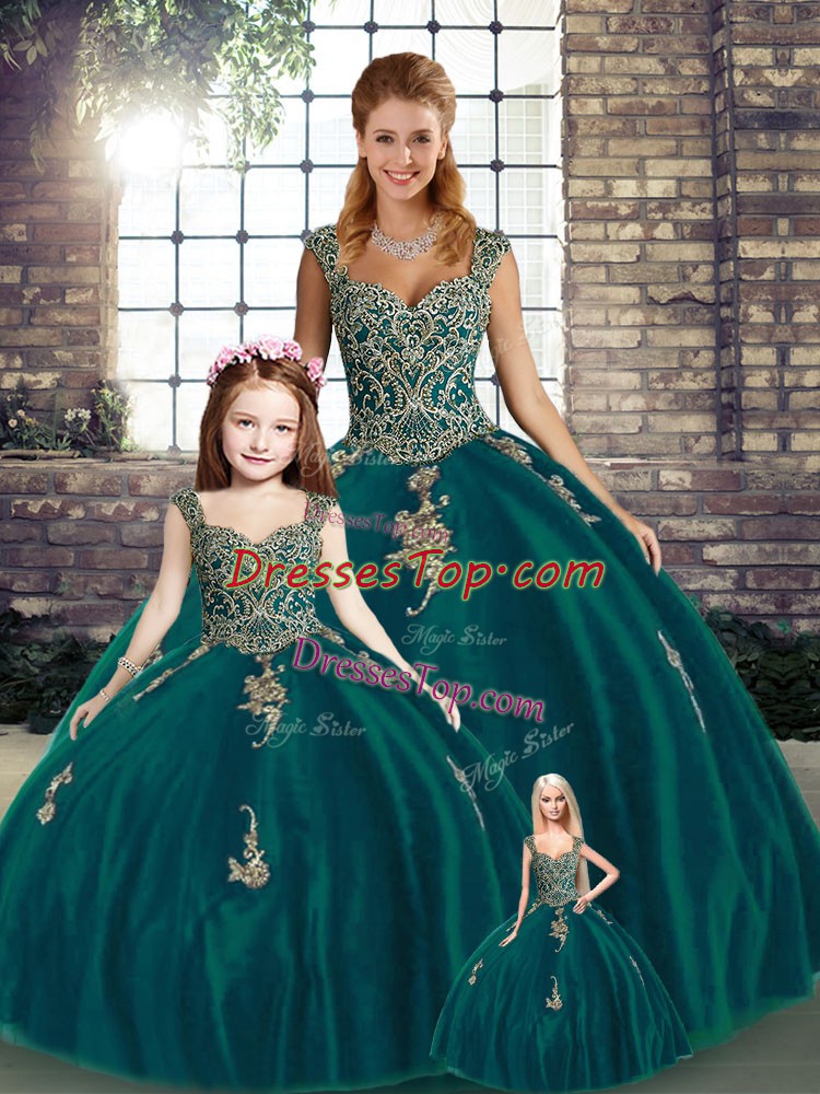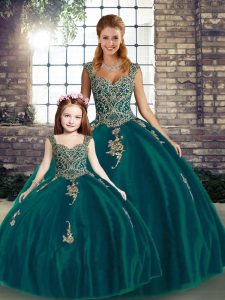 Sleeveless Tulle Floor Length Lace Up Sweet 16 Quinceanera Dress in Peacock Green with Beading and Appliques