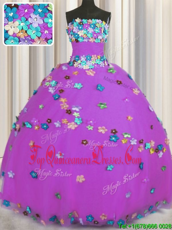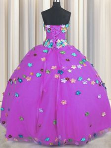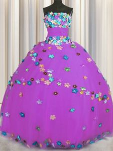 Sleeveless Tulle Floor Length Lace Up Sweet 16 Quinceanera Dress in Purple for with Hand Made Flower