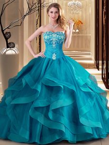 Sleeveless Tulle Floor Length Lace Up Vestidos de Quinceanera in Teal for with Embroidery and Ruffles