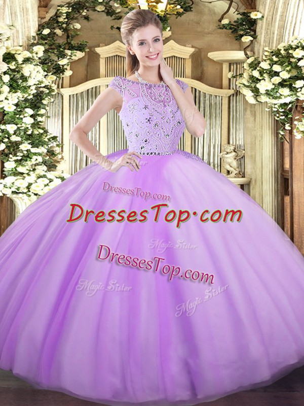 Sleeveless Tulle Floor Length Zipper 15th Birthday Dress in Lavender with Beading