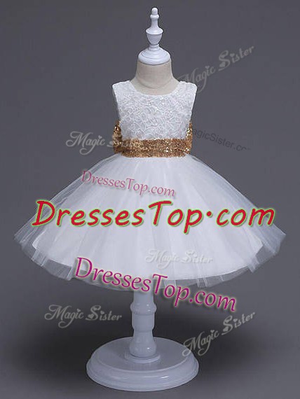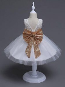Sleeveless Tulle Knee Length Zipper Kids Formal Wear in White with Lace and Bowknot