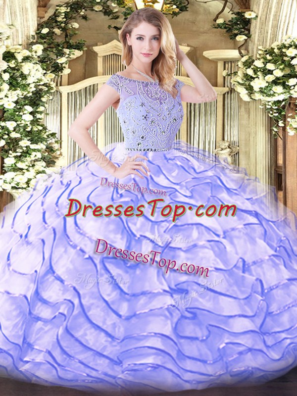 Sleeveless Tulle Sweep Train Zipper Ball Gown Prom Dress in Lavender with Beading and Ruffled Layers