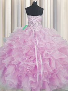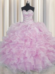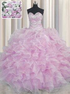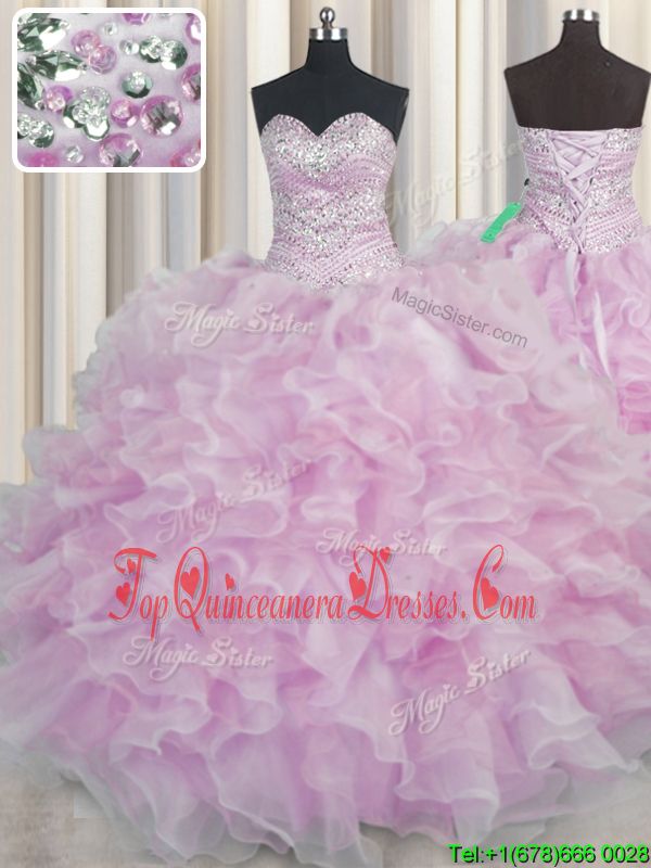 Smart Bling-bling Sleeveless Organza Floor Length Lace Up Quinceanera Dress in Lilac for with Beading and Ruffles