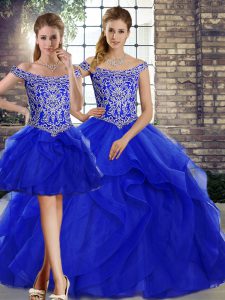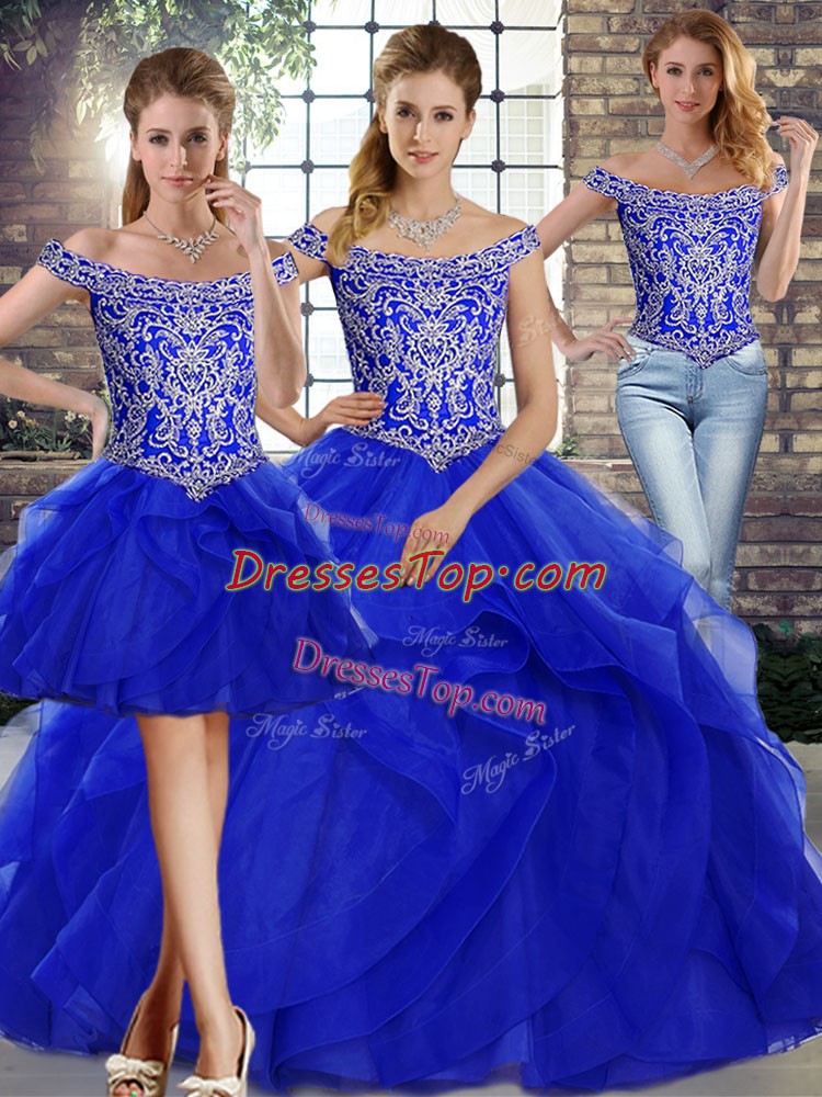 Smart Royal Blue 15th Birthday Dress Military Ball and Sweet 16 and Quinceanera with Beading and Ruffles Off The Shoulder Sleeveless Brush Train Lace Up