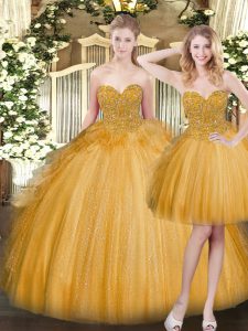 Smart Sleeveless Floor Length Beading and Ruffles Lace Up 15th Birthday Dress with Gold
