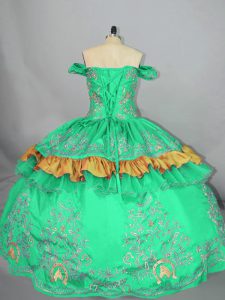 Smart Turquoise Ball Gowns Satin Off The Shoulder Sleeveless Embroidery Floor Length Zipper 15 Quinceanera Dress