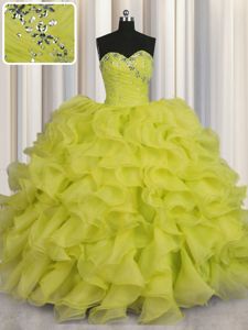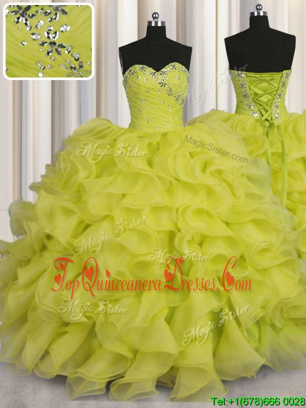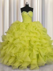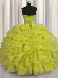Smart Yellow Green Ball Gowns Beading and Ruffles Quince Ball Gowns Lace Up Organza Sleeveless Floor Length