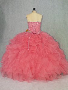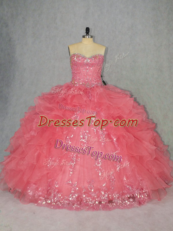 Sophisticated Ball Gowns 15 Quinceanera Dress Watermelon Red Sweetheart Organza Sleeveless Floor Length Lace Up