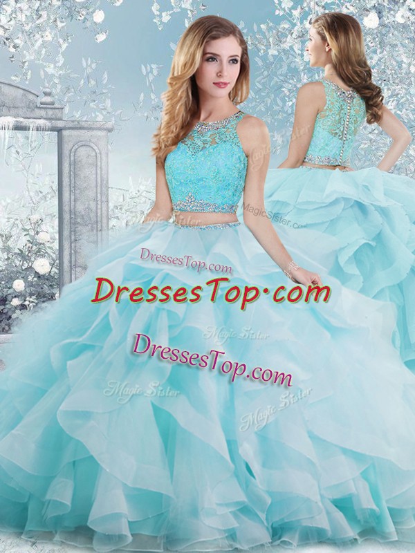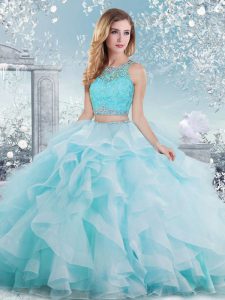 Sophisticated Ball Gowns Quince Ball Gowns Aqua Blue Scoop Organza Sleeveless Floor Length Clasp Handle