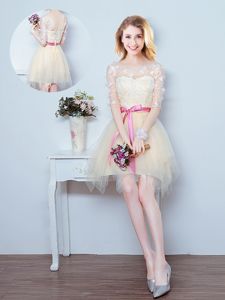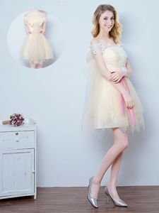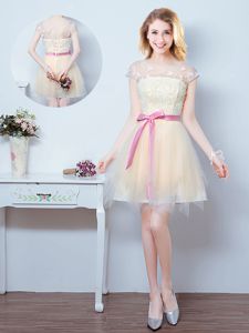 Sophisticated Champagne Tulle Lace Up Scoop Sleeveless Mini Length Damas Dress Lace and Appliques and Ruffles and Bowknot