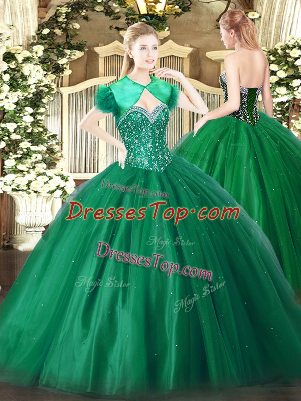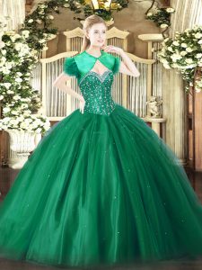 Sophisticated Dark Green Ball Gowns Sweetheart Sleeveless Tulle Floor Length Lace Up Beading Quinceanera Gown