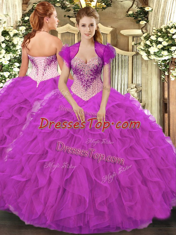 Sophisticated Fuchsia Sleeveless Beading and Ruffles Floor Length Quince Ball Gowns