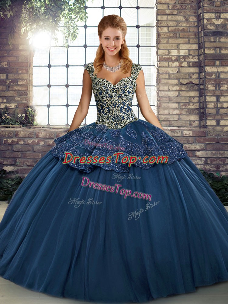 Sophisticated Navy Blue Straps Neckline Beading and Appliques Vestidos de Quinceanera Sleeveless Lace Up