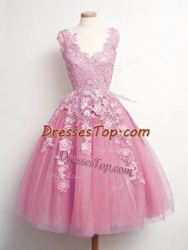 Sophisticated Pink Lace Up V-neck Lace Vestidos de Damas Tulle Sleeveless