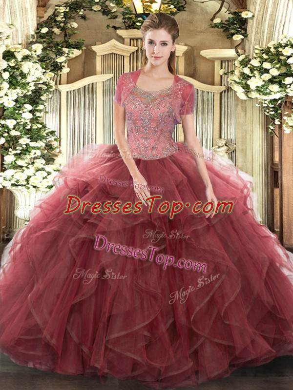 Sophisticated Sleeveless Tulle Floor Length Clasp Handle Quince Ball Gowns in Burgundy with Beading and Ruffled Layers