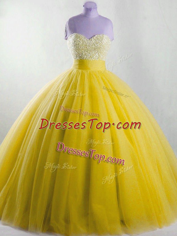 Sophisticated Sleeveless Tulle Floor Length Lace Up Quince Ball Gowns in Yellow with Beading