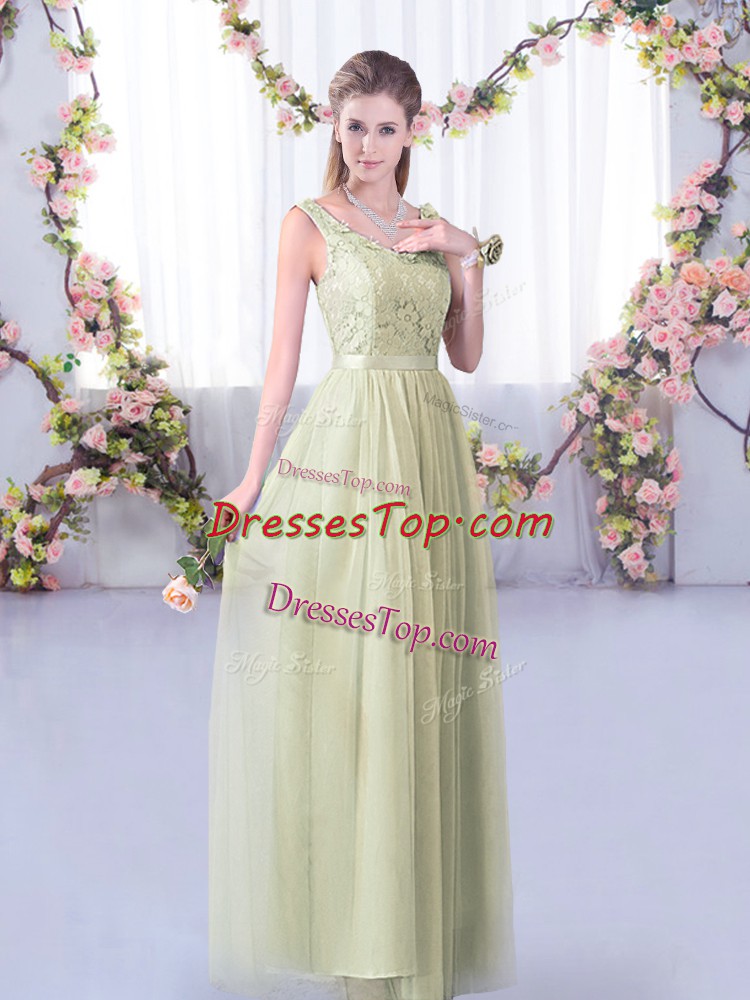 Sophisticated V-neck Sleeveless Dama Dress for Quinceanera Floor Length Lace and Belt Yellow Green Tulle