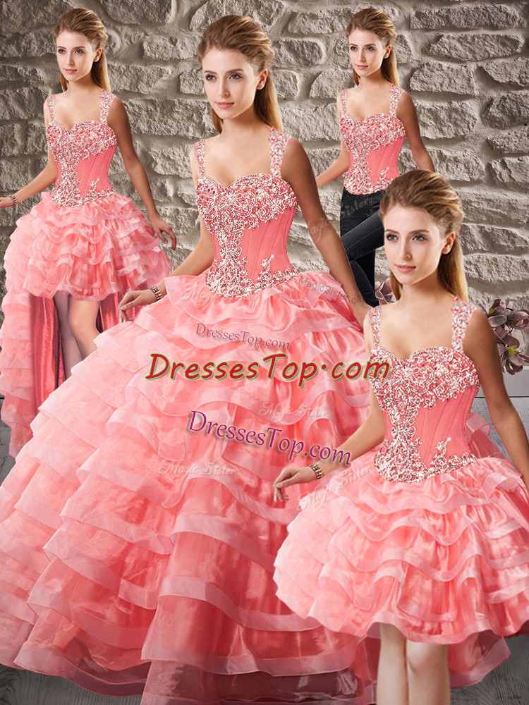 Sophisticated Watermelon Red Organza Lace Up Quinceanera Dresses Sleeveless Court Train Beading and Ruffled Layers