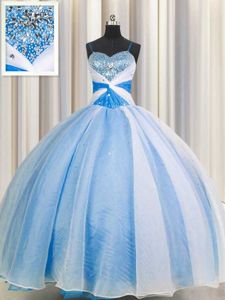 Spaghetti Straps Baby Blue Ball Gowns Beading and Sequins and Ruching Ball Gown Prom Dress Lace Up Chiffon Sleeveless Floor Length