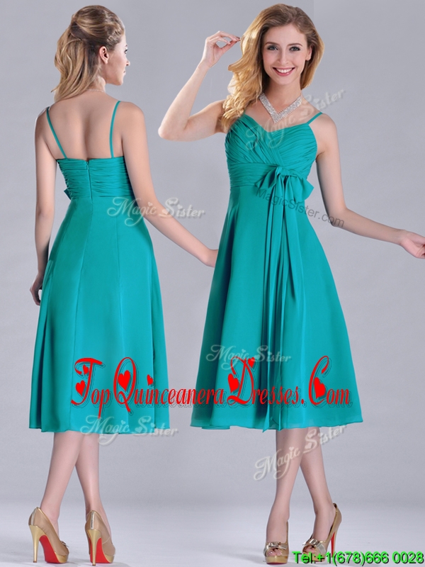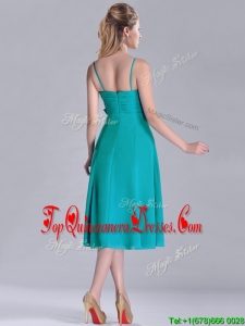 Spaghetti Straps Ruched and Belted Turquoise Dama Dress in Tea Length
