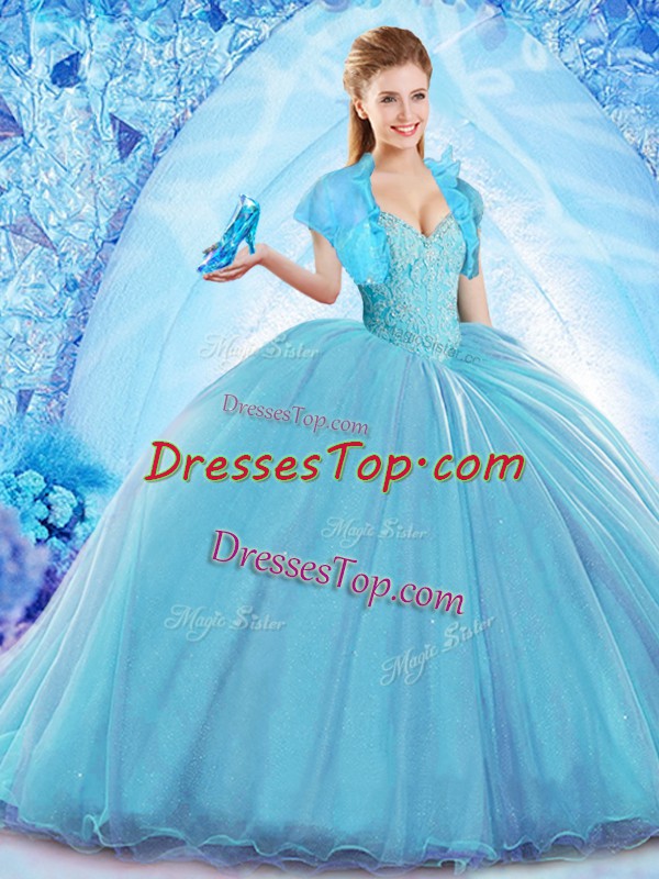 Spectacular Baby Blue Sleeveless Sweep Train Beading Quinceanera Gown
