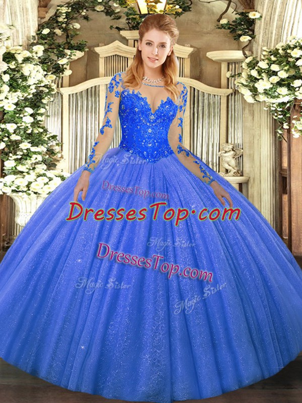 Spectacular Blue Lace Up Scoop Lace Sweet 16 Dress Tulle Long Sleeves