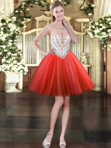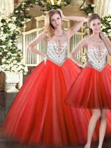 Spectacular Coral Red Ball Gowns Scoop Sleeveless Tulle Floor Length Zipper Beading Sweet 16 Dresses