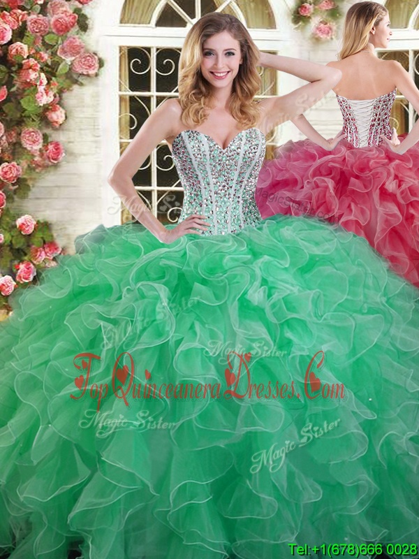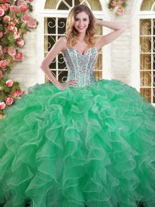 Spectacular Floor Length Lace Up Sweet 16 Dresses Green and In for Military Ball and Sweet 16 and Quinceanera with Beading and Ruffles